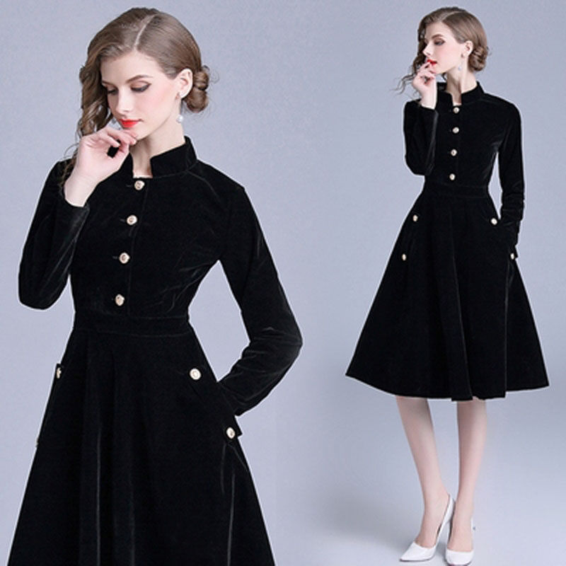 Velvet Retro Stand Collar Long Sleeve Swing Dress Elegant Slim Fit Fall Winter
