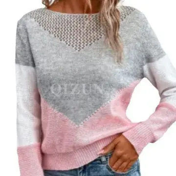 Women Slim Fit Hollow-Out Knit Sweater – Color Block Crew Neck Pullover