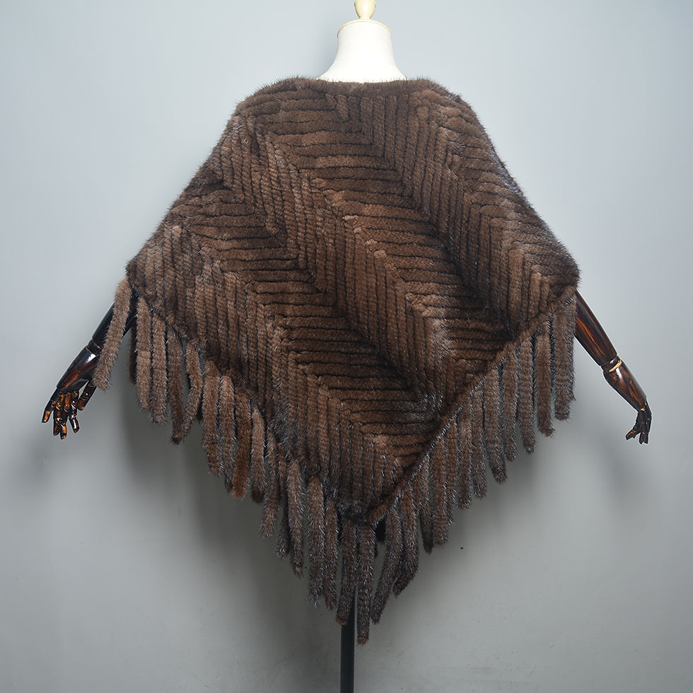 Women Knitted Real Mink Fur Shawl with Tassels and Big Size Cape Design